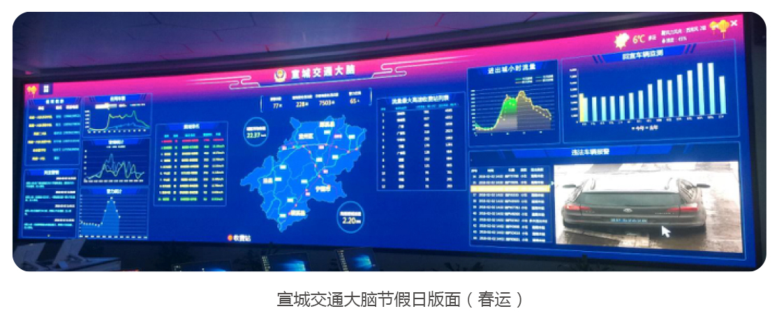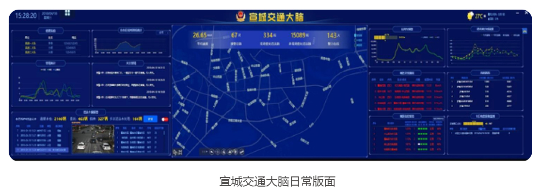 目前,纳入宣城交通大脑监管范围的道路共485条,总长度为407千米,已接入的设备及数据包括:62个卡口、327路视频监控、143套电子警察、46处测速设备、113个信号机等设备。宣城交通大脑基本具备了路网与路口承载力计算等多项功能,并在分析研判、疏堵保畅和精准打击交通违法行为等方面取得了显著成效。