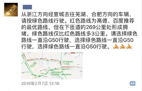 4、利用互联网、微信、微博发布路况信息,引导往芜湖、合肥车辆沿G50沪渝高速继续行驶。